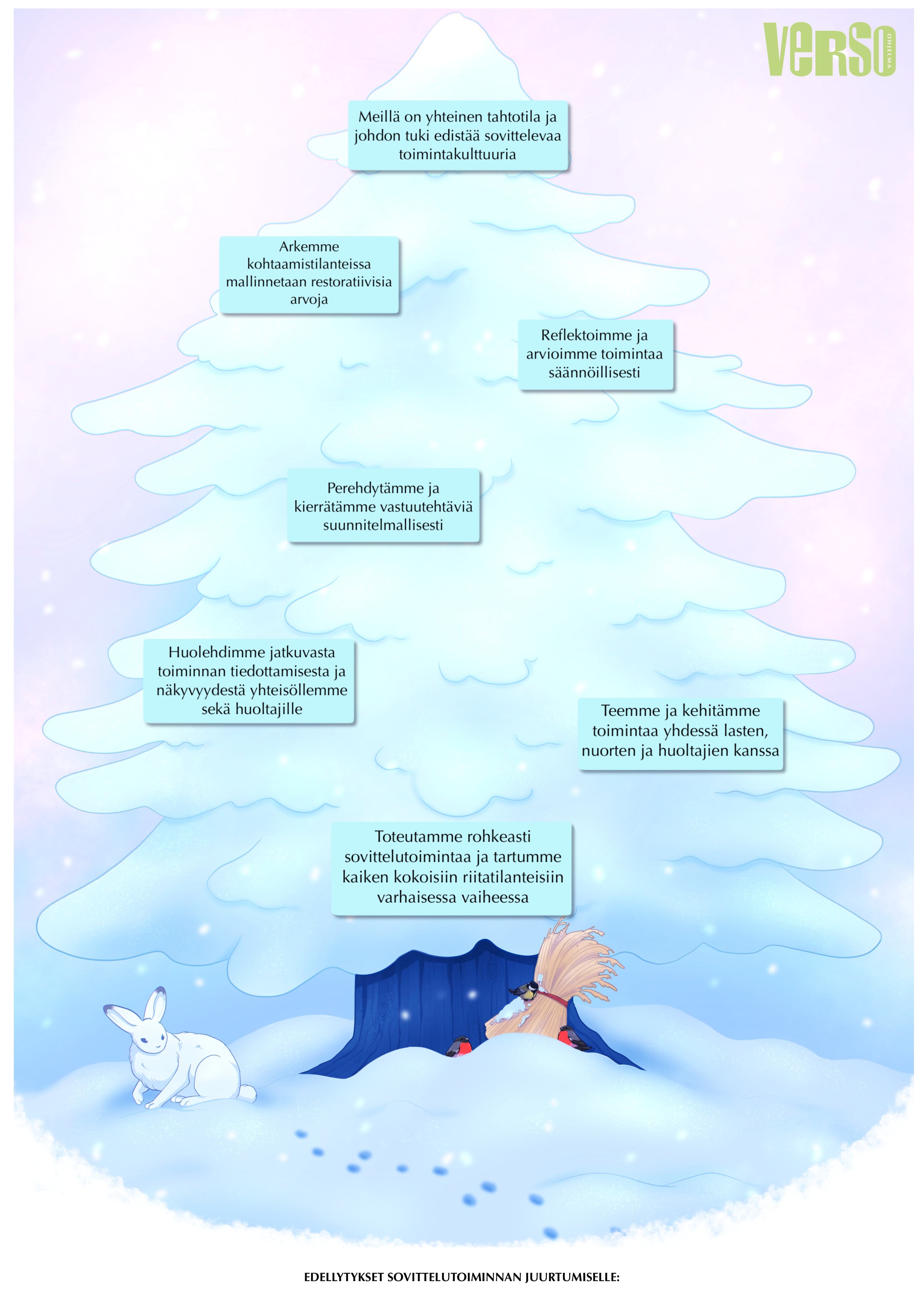 Vertaisuudessa on voimaa! VERSO-ohjelma tarjoaa maksutonta mentoritoimintaa koulutetuille yksiköille. Mentoriryhmä voidaan koota alueen sovittelusta innostuneista yhteisöistä. Vertaismentorit saavat tukea toisiltaan sekä VERSO-ohjelman kouluttajilta. Mentoritoiminnan kautta jaetaan uusia näkökulmia sovittelusta, sekä mahdollisuus päästä viemään Versoa, MiniVersoa tai RESTOa nextille levelille! Alla ohjeita Mentoriryhmän perustamiseen ja esimerkkejä tapaamisten aiheiksi: