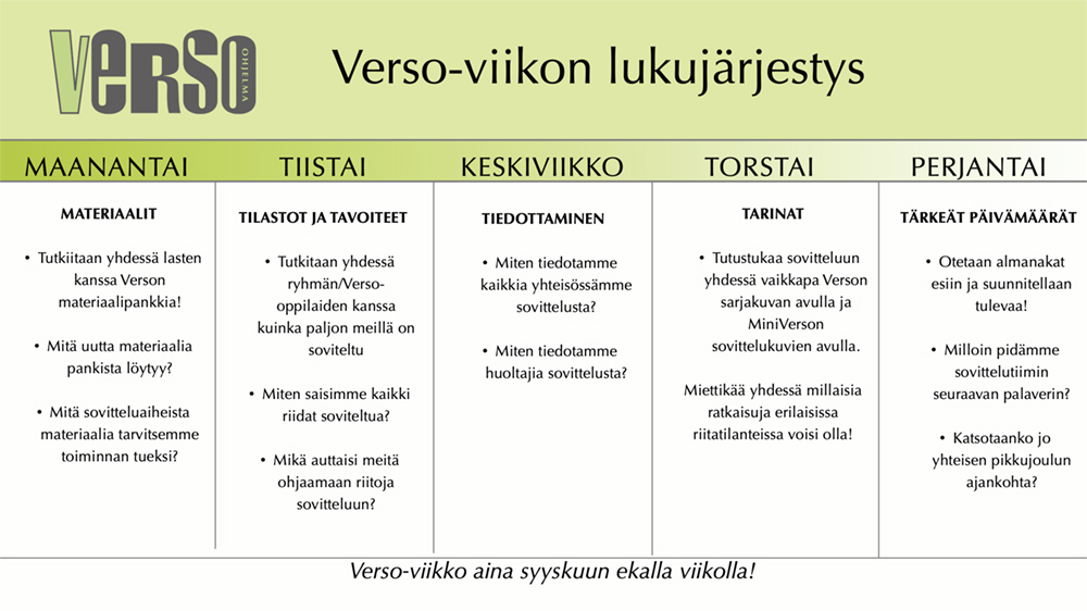 Valtakunnallinen VERSO-viikko syyskuun alussa on vuosittainen teemaviikko opetus- ja kasvatuskentän sovittelutoiminnan esiin nostamiseksi.